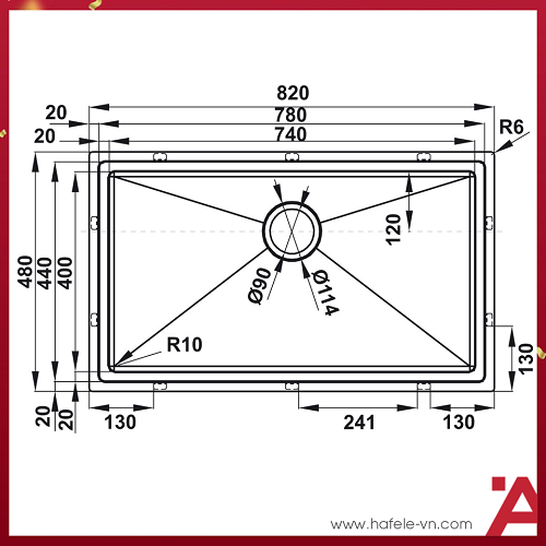 Cắt đá lắp âm (mm – Tính từ mép ngoài mặt đá): 820*485