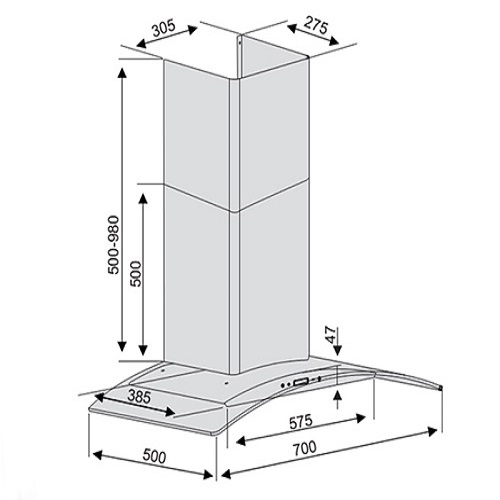 Chất liệu Inox – kính 6mm Điều khiển bằng phím cảm ứng Đèn báo sáng đang hoạt động Ống thoát Ø150mm Đèn Led tiết kiệm điện: 2Wx2 Bộ lọc 1 than hoạt tính và 2 lưới inox Baffle Lẫy cài inox chống cháy Động cơ turbin đôi Công suất động cơ 190W Công suất hút: 1050m3/h Độ ồn: 48dbA Kích thước: 700mm |