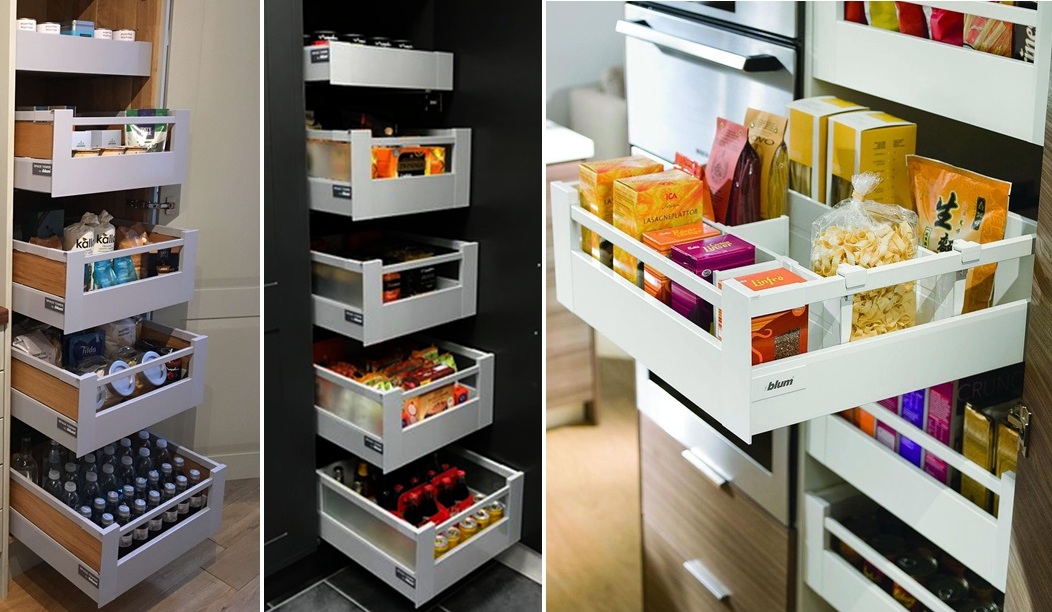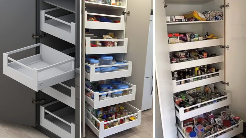 Tủ kho / tủ lưu trữ / tủ đồ khô Tandembox (Tandembox Space Tower) có cấu hình tiêu chuẩn bao gồm 1 bộ ray hộp âm Tandembox Y1 30kg được lắp ở vị trí cao nhất, 4 bộ ray hộp âm Tandembox Y3 hoặc Y6 30kg được lắp ở các tầng bên dưới và 4 bộ bản lề ngăn kéo âm mở 155°. Tuy nhiên, ứng dụng thực tế có thể biến hóa linh hoạt nhằm đáp ứng nhu cầu đa dạng của khách hàng. Cụ thể, 4 bộ ngăn kéo âm bên dưới vẫn sử dụng được với ray hộp âm Tandembox Y2, Y4 hoặc Y5 để tạo phong cách thiết kế riêng.